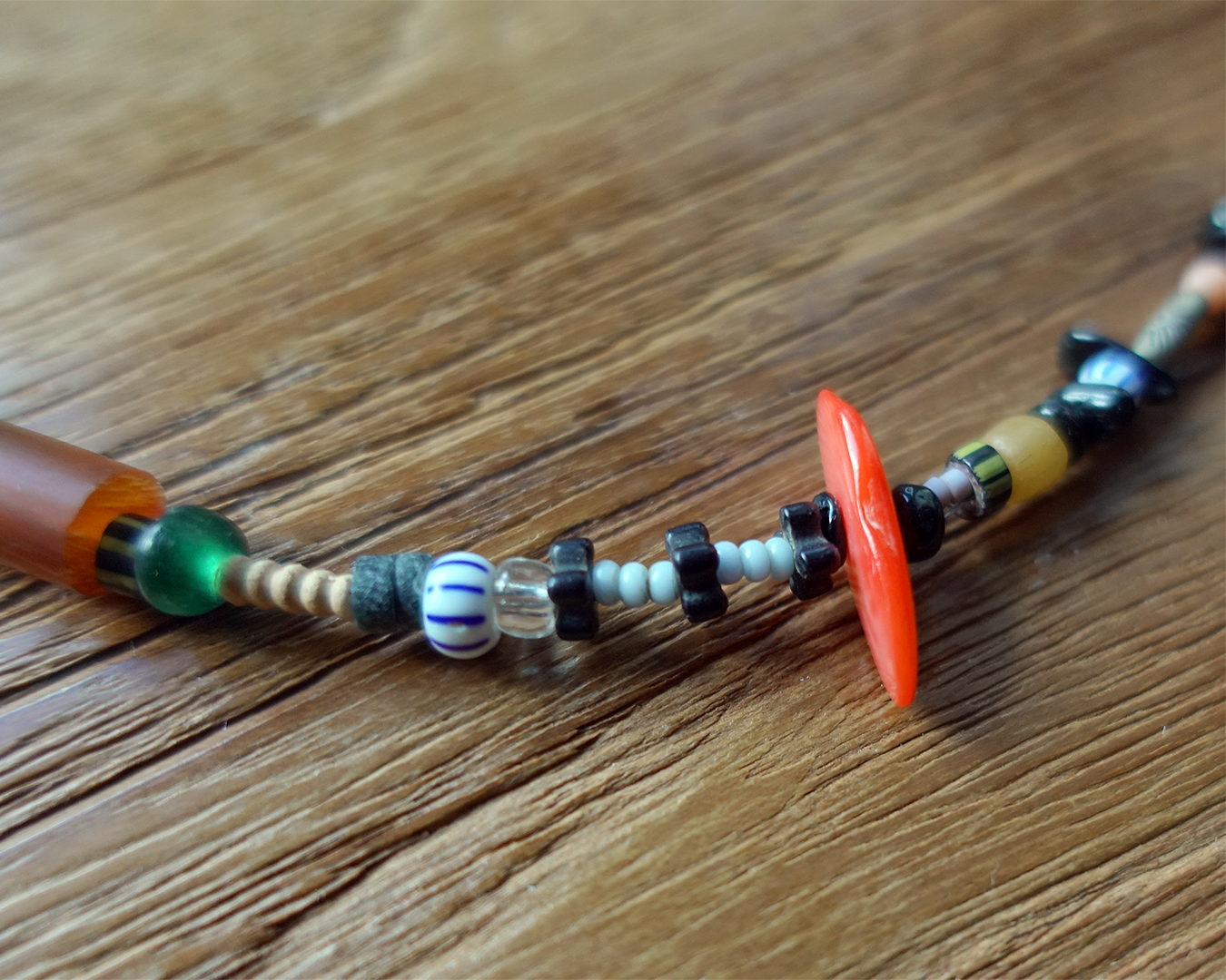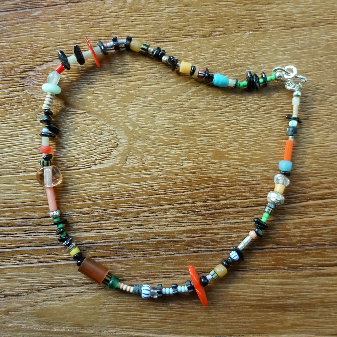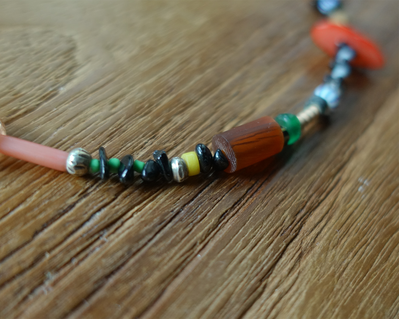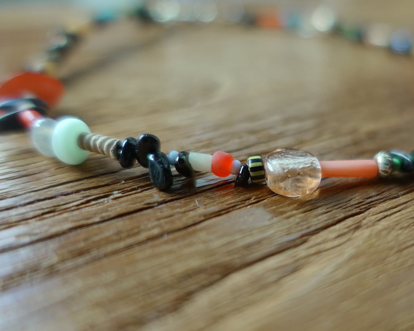 作り手の温もりやヴィンテージによる風合いを感じるビーズを、一粒一粒連ねて一つの輪っかにいたしました。作られた産地も年代も、また背景も違うビーズ達ですが、異なる色彩や異素材が生むギャップが可愛く、それぞれが引き立て合い、またなんとも言えないリズムを生みます。