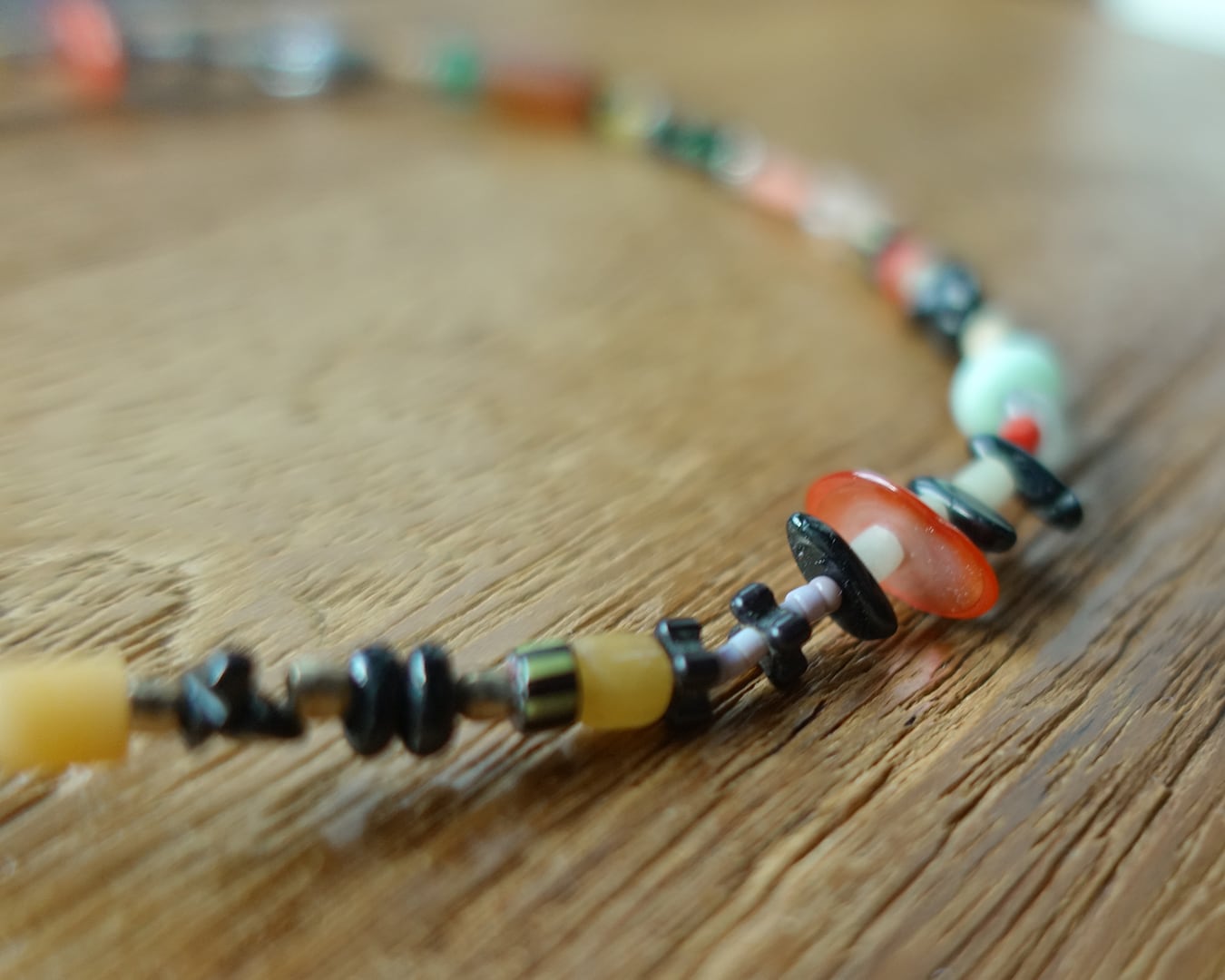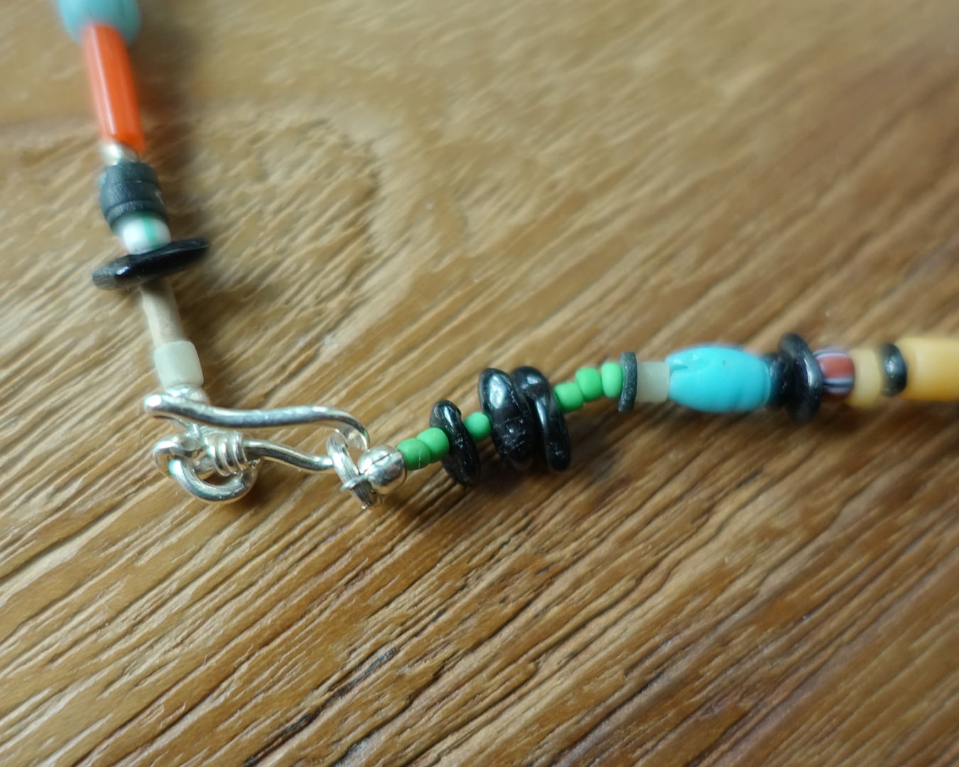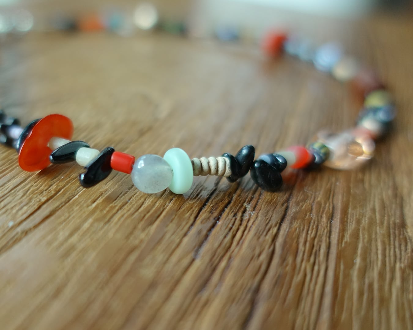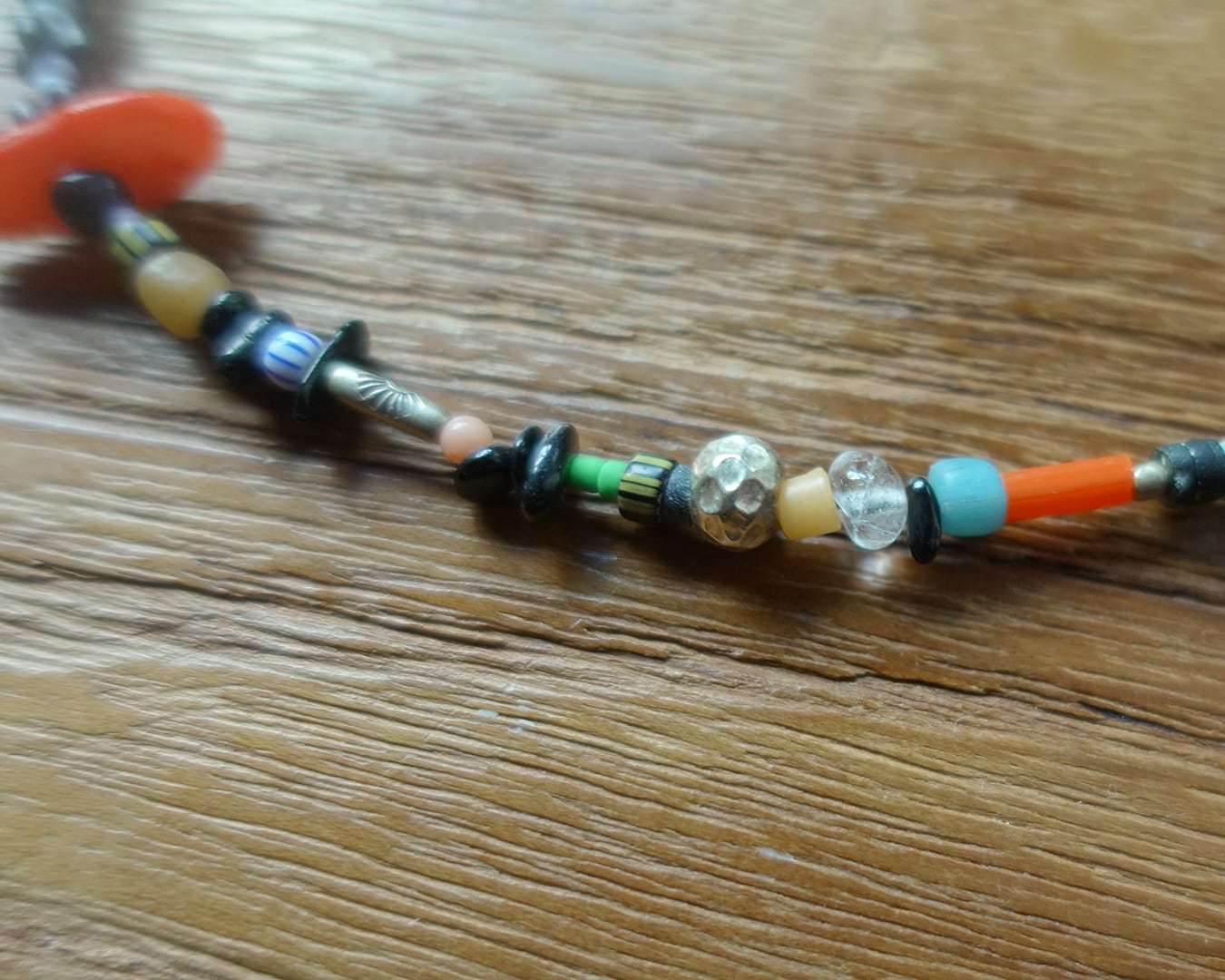 作り手の温もりやヴィンテージによる風合いを感じるビーズを、一粒一粒連ねて一つの輪っかにいたしました。作られた産地も年代も、また背景も違うビーズ達ですが、異なる色彩や異素材が生むギャップが可愛く、それぞれが引き立て合い、またなんとも言えないリズムを生みます。
