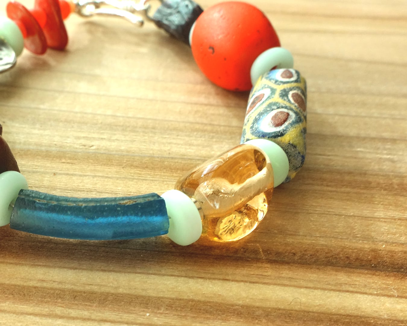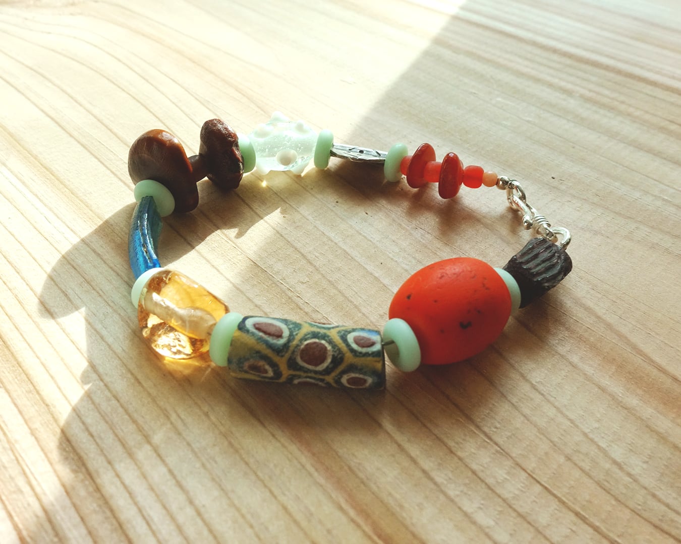 アフリカ、タイ、インドネシア等で、手作業で作られたビーズを使用した、ヴィンテージガラスビーズブレスレット。ガラスや木の実、シルバーなど、素材の違いが楽しいブレスレッドを作りました。鮮やかな赤が鮮やかなアクセント。